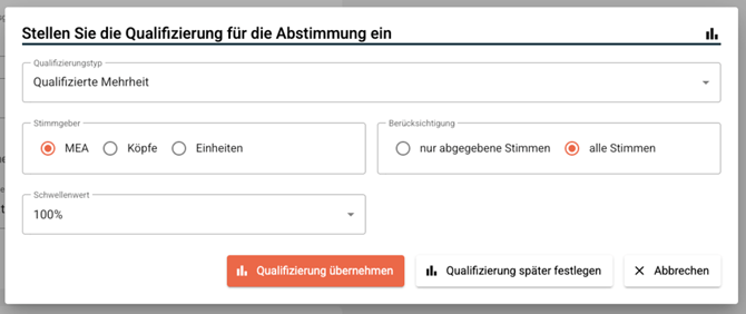 Für die korrekte Konfiguration ist im Beschlusspunkt in den Einstellungen zur Qualifizierung die Option „qualifizierte Mehrheit“ auszuwählen. Anschließend sollte bei der Berücksichtigung die Einstellung „alle Stimmen“ gewählt werden. Der Schwellenwert ist in diesem Zusammenhang auf 100 % festzulegen, um das gewünschte Abstimmungsergebnis sicherzustellen.