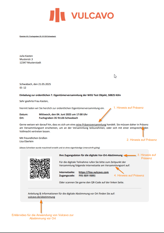 Auf der Titelseite der durch Vulcavo generierten Einladung finden Sie nach den Basisdaten der Versammlung immer den QR-Code mit abgedruckt. Dieser QR-Code dient als Zugang zu unserem Abstimmungstool. Auch bei einer reinen Präsenzveranstaltung ist der Zugang über den QR-Code erforderlich, damit Eigentümer vor Ort an Abstimmungen teilnehmen können. Dadurch wird sichergestellt, dass die Stimmabgabe ordnungsgemäß erfasst und zugeordnet werden kann.