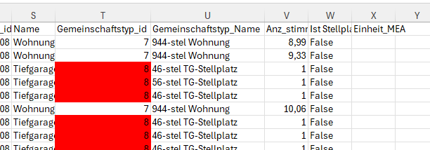 Die Gemeinschaftstypen-ID darf pro Gemeinschaftstyp_Name nur einmal verwendet werden. D.h. in diesem Fall wird die Gemeinschaftstyp-ID "8" für zwei verschiedene Gemeinschaftstyp-Namen verwendet (46-stel TG Stellplatz und 56-stel TG Stellplatz).