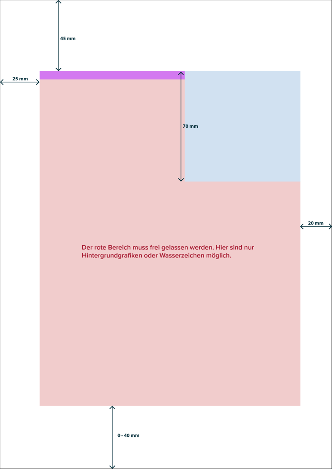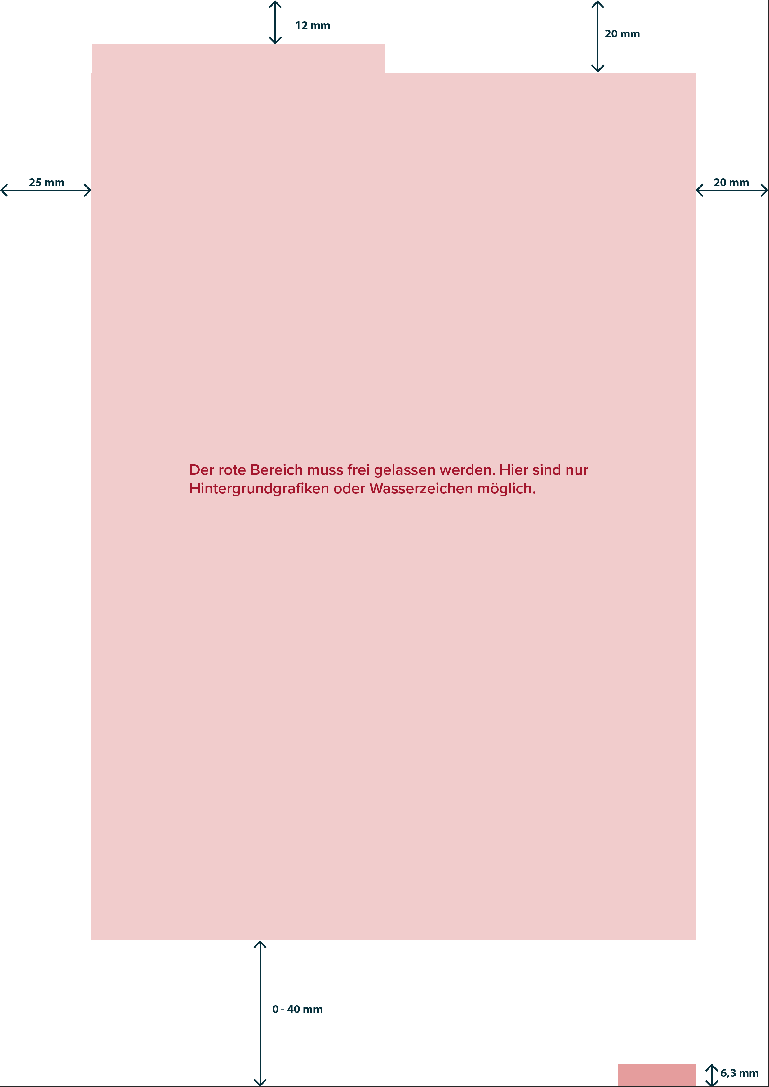 Hier gilt ebenfalls: Bis auf ein optionales Wasserzeichen/Hintergrundmotiv muss der rot markierte Bereich frei bleiben, da die Software hier Inhalte hineinschreibt.