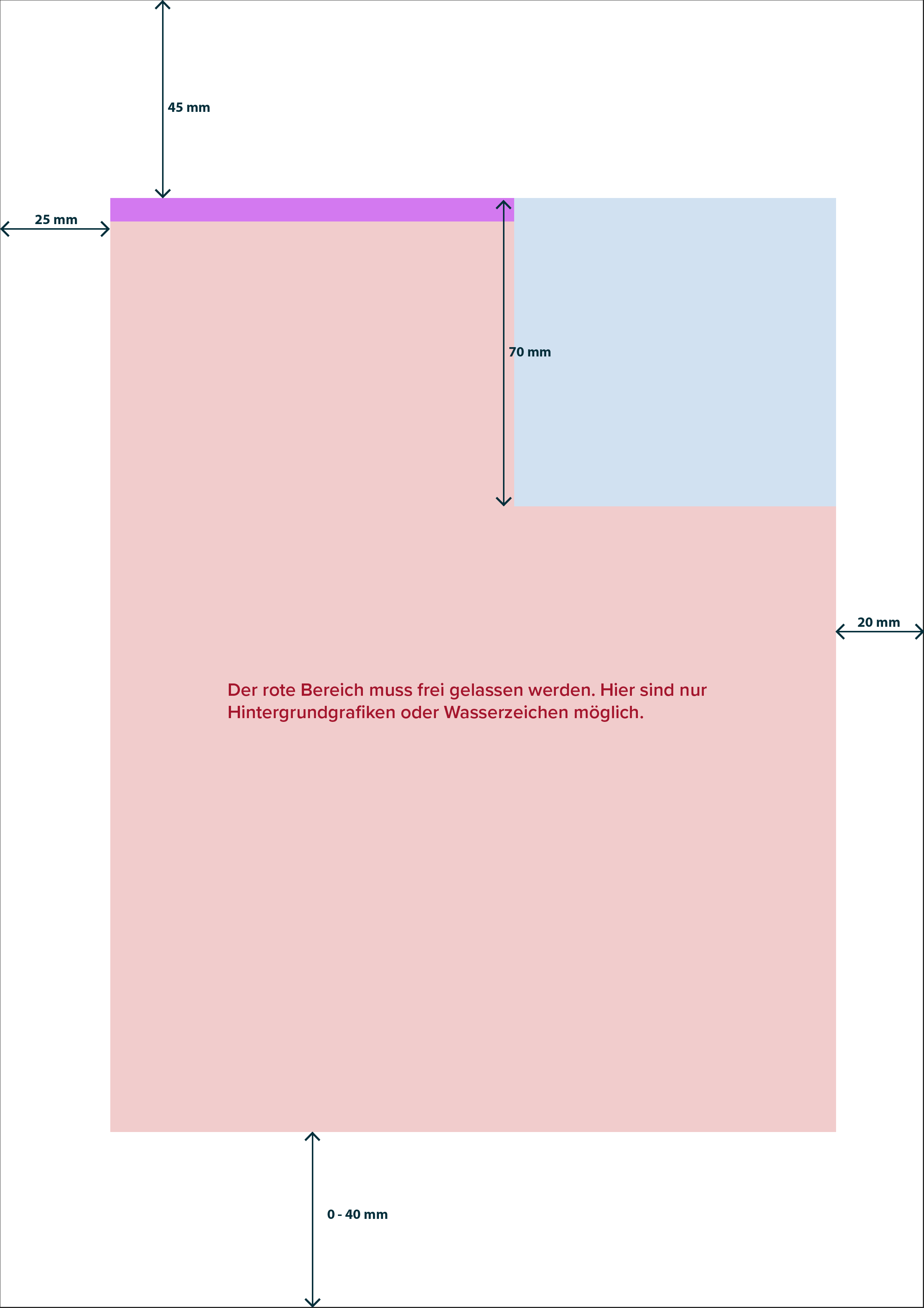 OPTIONAL: Der lila Bereich auf der Titelseite ist Ihre Absenderadresse. Falls diese beinhaltet ist, halten Sie bitte einen Abstand von 25 Millimetern nach links und 45 Millimetern nach oben ein. Andernfalls wird die Absenderadresse von der Software automatisch eingefügt.